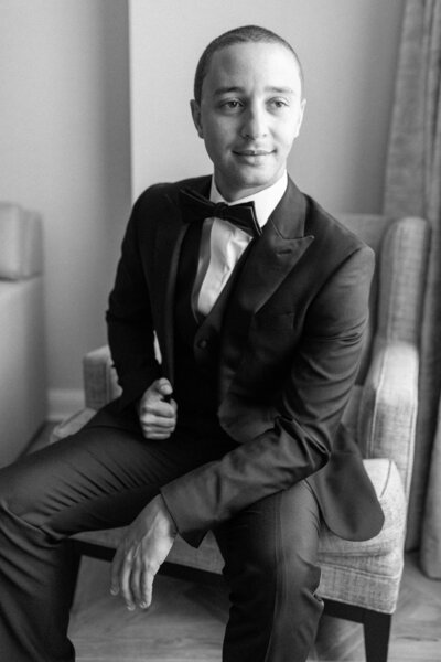 You'll begin with the groom and groomsmen, and if they're getting ready offsite, you'll be on your own. They will be instructed to be fully dressed - you should only be photographing finishing touches such as putting on tie, jacket, and shoes. I like to have the best man, dad, or a brother participate in this too!